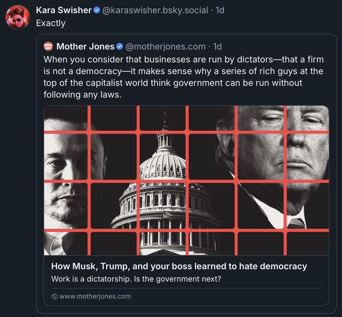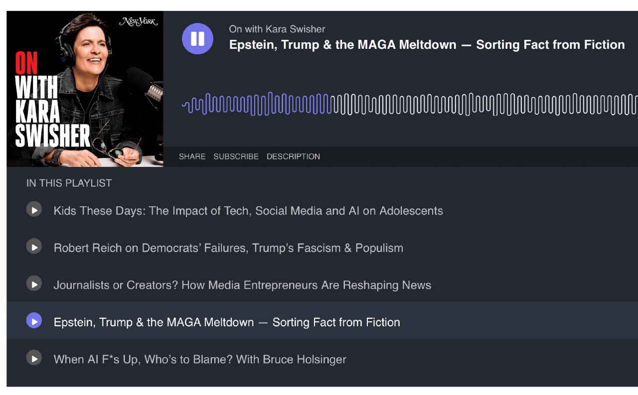 If you aren’t listening to Kara Swisher’s On podcast or following her on Bluesky, maybe tune in. A veteran journalist of Silicon Valley who knows today’s tech titans since they were startups in the early 2000s, Swisher gives unflinching critiques at the intersection of media, tech and politics. This episode breaking down the lingering Epstein controversy and why Dems need to understand is a great primer.