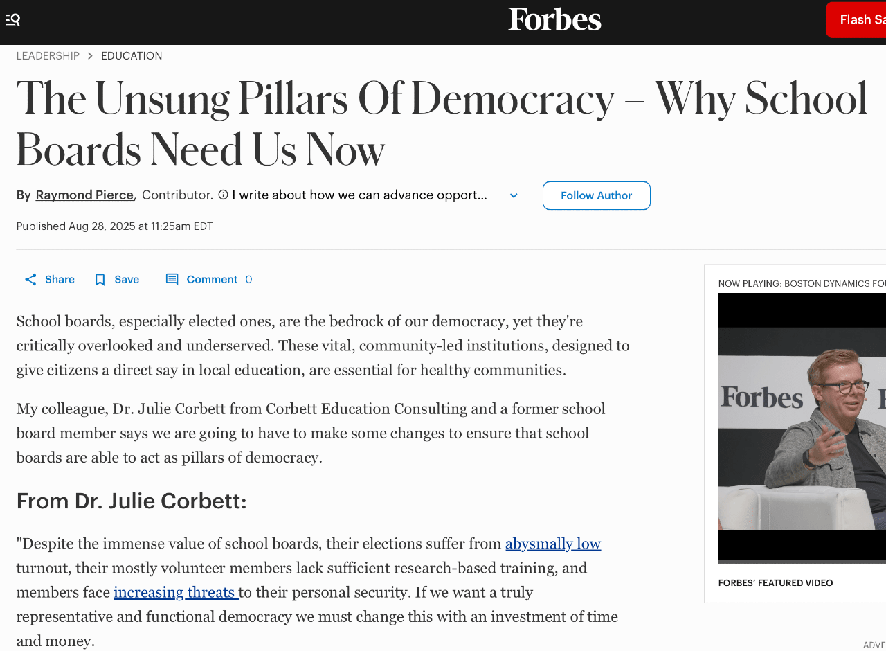 In a recent Forbes piece, The Unsung Pillars Of Democracy – Why School Boards Need Us Now, Dr Julie Corbett argues school boards are our closest form of democracy and deserve your attention. Whether you know it or not, national political fights are surfacing in school boards and directly impacting your community – from vaccine policies to immigration enforcement to gender-neutral bathrooms.