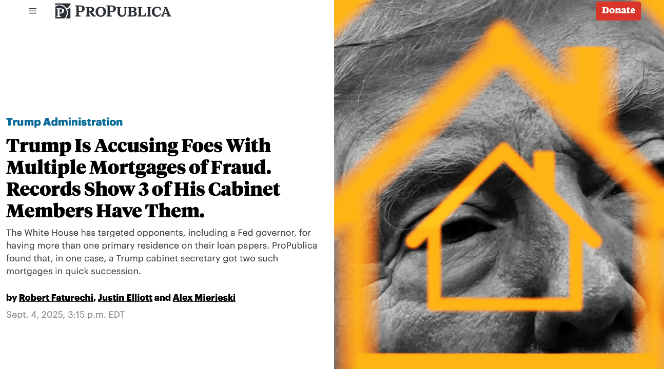 ProPublica remains an exceptional source for investigative journalism. This recent piece follows the thread from Trump’s effort to fire Fed Gov Lisa Cook and the Dept of Justice’s announcement that they are opening a criminal inquiry into Cook following the allegations. So far, the Federal Reserve has maintained its independence from Trump, which we all know is the reason Trump is firing Cook. If the allegations are really the issue, ProPublica reveals 3 Cabinet officials who should be facing the same scrutiny as Cook.