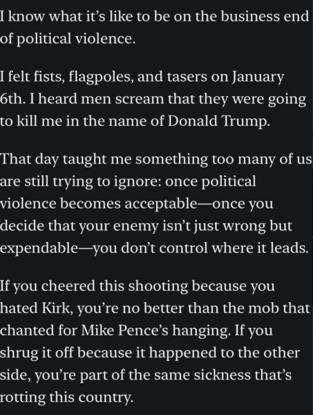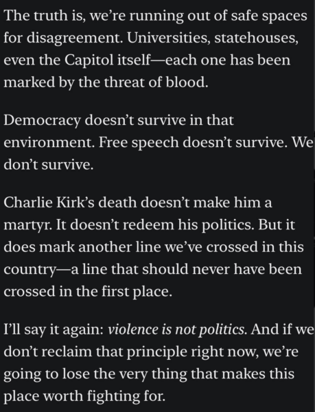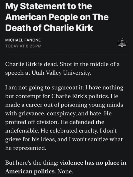 Watch this brief statement from Mayoral candidate Mamdani on Kirk’s assassination and our plague of violence. Former police officer Michael Fanone, permanently injured while attempting to protect the Capitol on Jan 6, also put out a statement on political violence reminding us both things can be true: we can be appalled by this murder and still condemn Krik’s politics and methods.