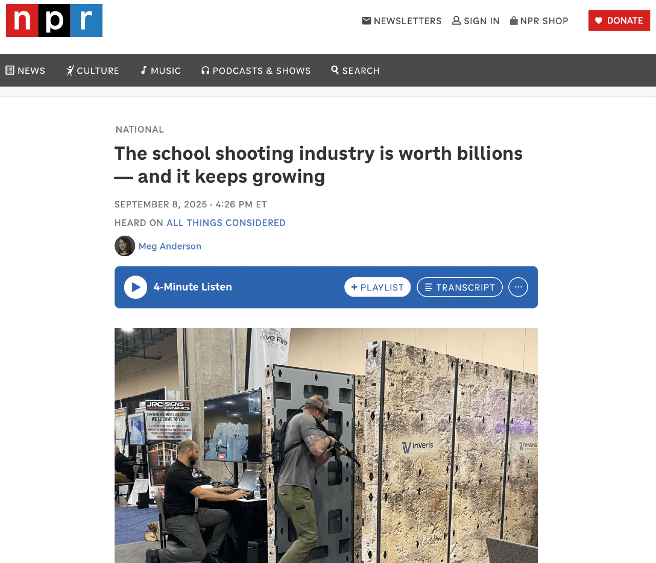 Gun violence is the common factor. We aren’t doing much to stop school shootings, but we are growing a massive, billion dollar industry around school shootings, says NPR.
