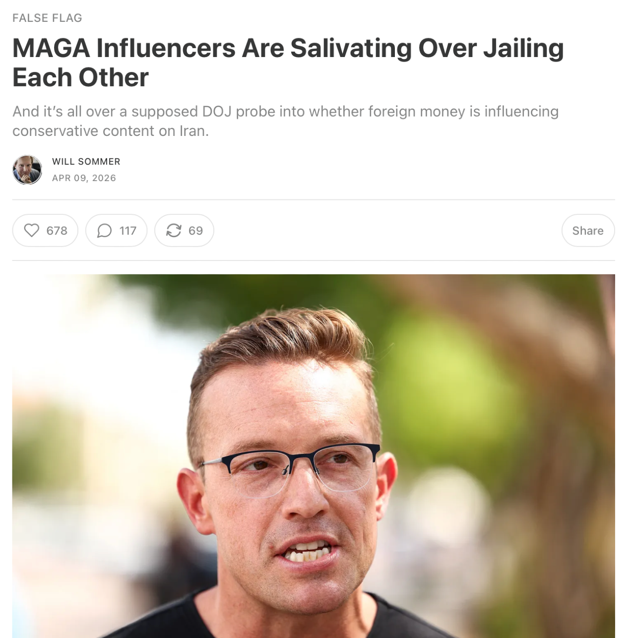 Will Sommer has been covering the insane world of MAGA influencers for almost a decade. His newsletter, False Flag, gives you the inside story so you don’t have to watch it. But understanding these influencers is critical to knowing where MAGA is going- and right now, they’re attacking each other and Trump- a good sign for how this movement might eat itself. Every issue of False Flag is insane, but this one talks about conservatives cheering for Dept of Justice criminal probes into each other.