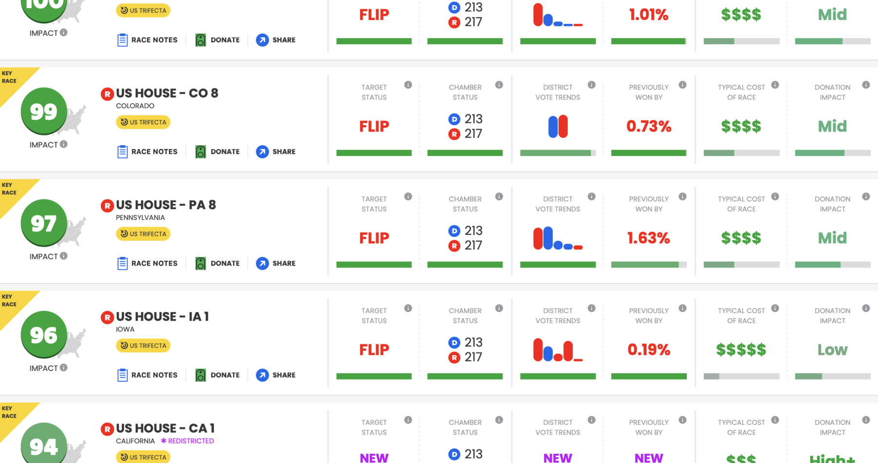 Here’s the number that should stop you cold: Democrats need to flip just five seats to take back the House of Representatives in 2026. Five. Flip the States has already identified 11 Republican-held House districts with Impact Scores above 90 — the highest tier of winnability and structural importance. These are not wishful targets. These are races where the margins were razor-thin, where the trends are moving, and where targeted investment can tip the outcome. A smarter strategy, applied right now, could hand Democrats the House majority — and with it, a real check on the unchecked: